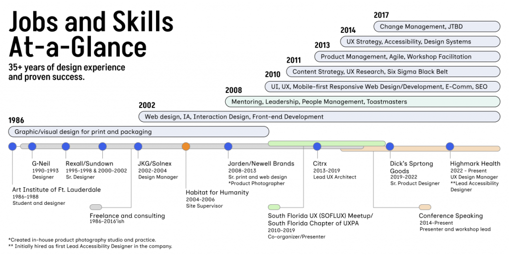- 2022-present: Highmark Health, lead accessibility designer, now UX Design Manager of Design Systems and Standards